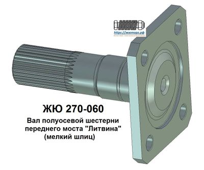 Изготовленный из высокопрочной стали цельный вал предназначается для замены сварного вала полуосевой шестерни переднего моста вездеходного транспортного средства "Литвина". Выполнен с мелкомодульными эвольвентными шлицами.