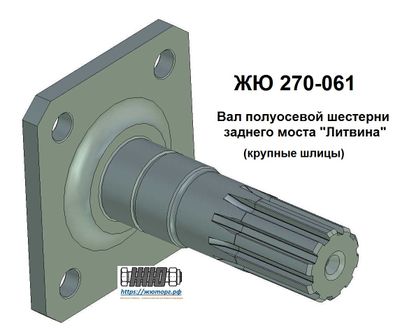Изготовленный из высокопрочной стали цельный вал предназначается для замены сварного вала полуосевой шестерни заднего моста вездеходного транспортного средства "Литвина". Имеет прямобочные шлицы.