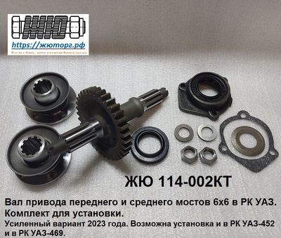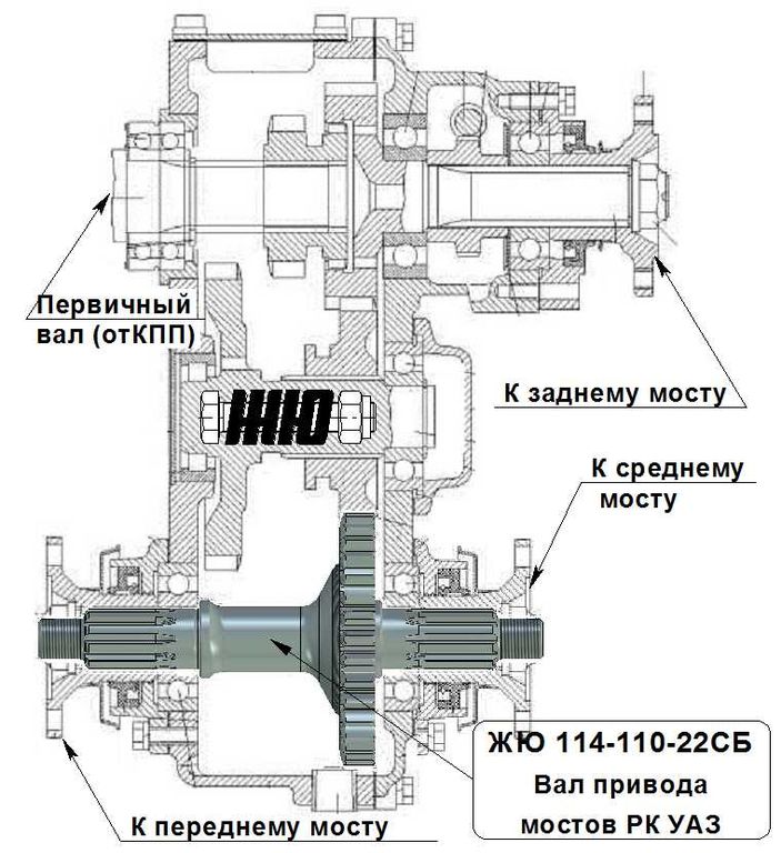 "Проходной" вал привода мостов в раздаточную коробку УАЗ-452 (прямозубую) пользуется большой популярностью у строителей вездеходов 6х6 для привода среднего и переднего мостов. И у строителей спортивных аппаратов и "переломок" из-за удобного расположения выходных концевиков вала ЖЮ-114.